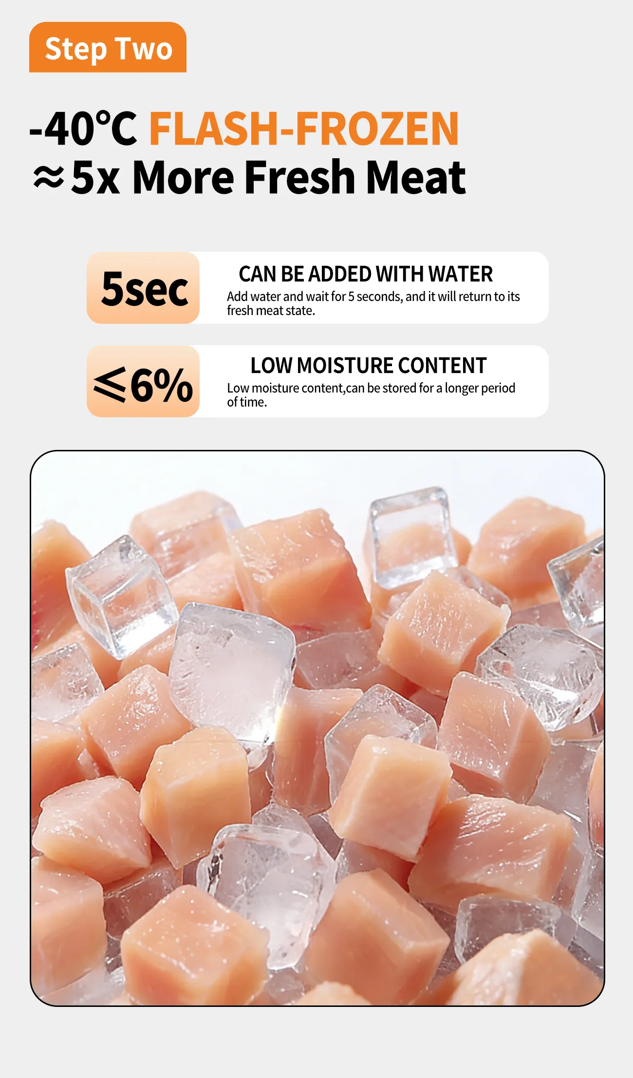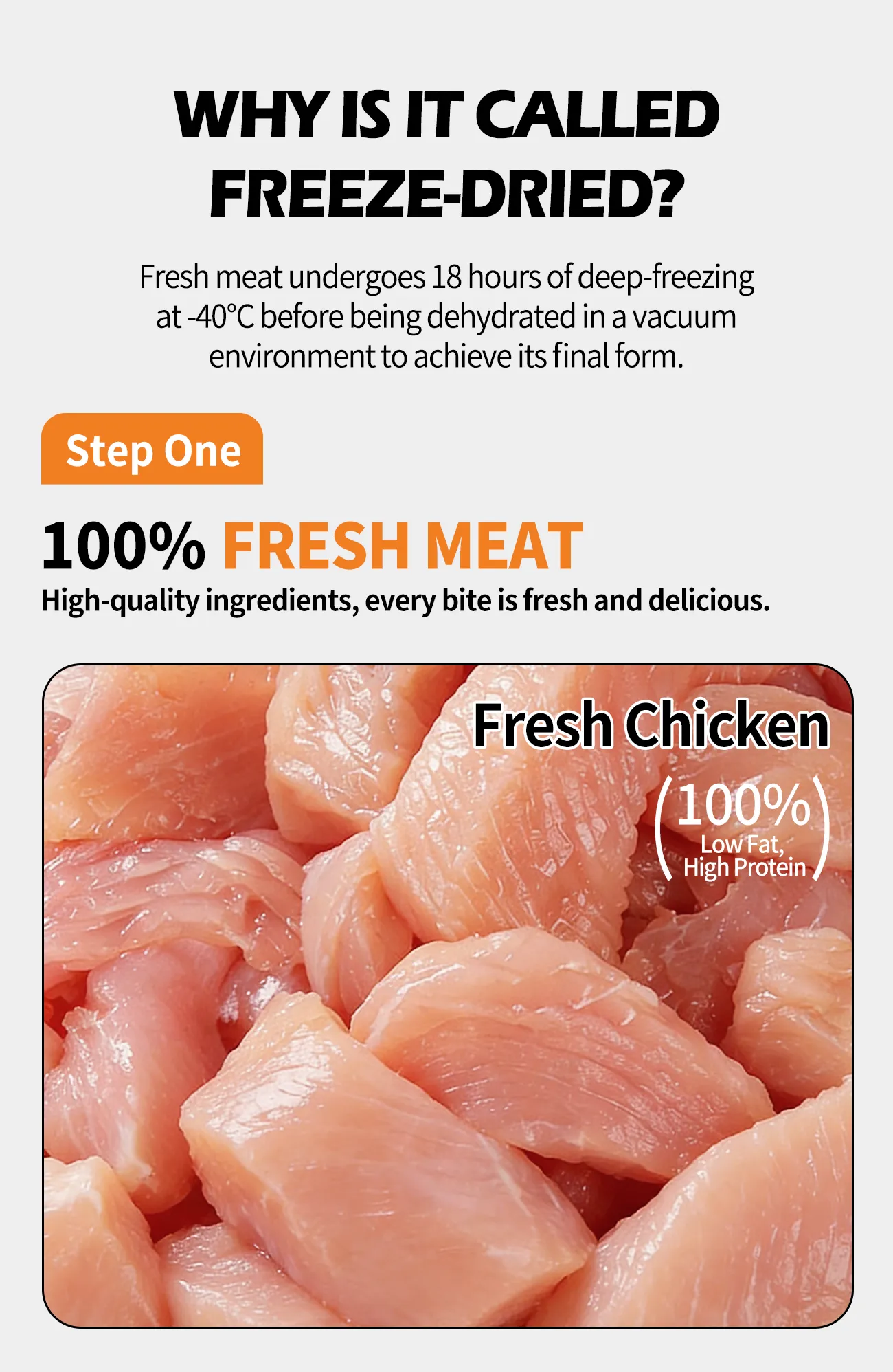 Fresh meat undergoes 18 hours of deep-freezing at -40°C before being dehydrated in a vacuum environment to achieve its final form.