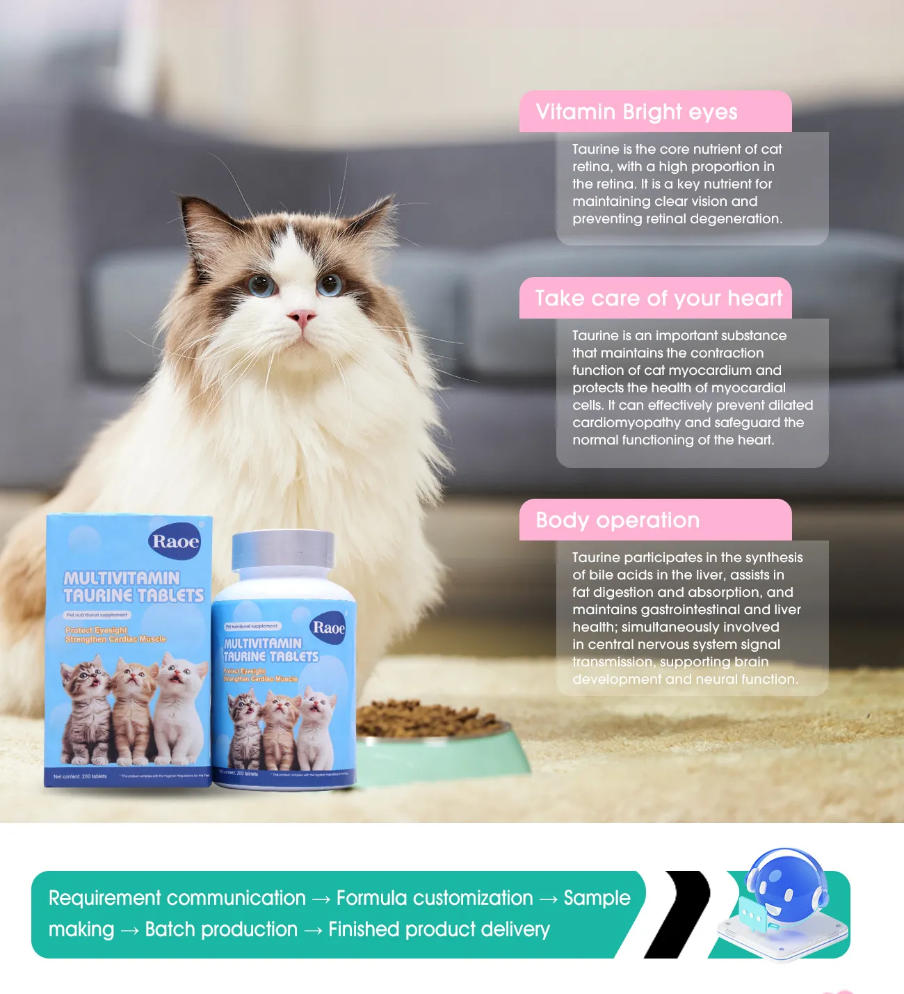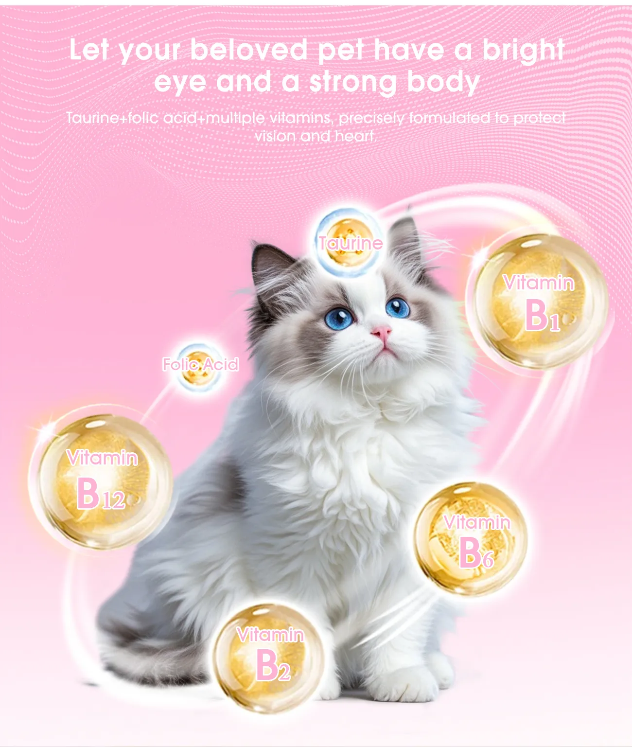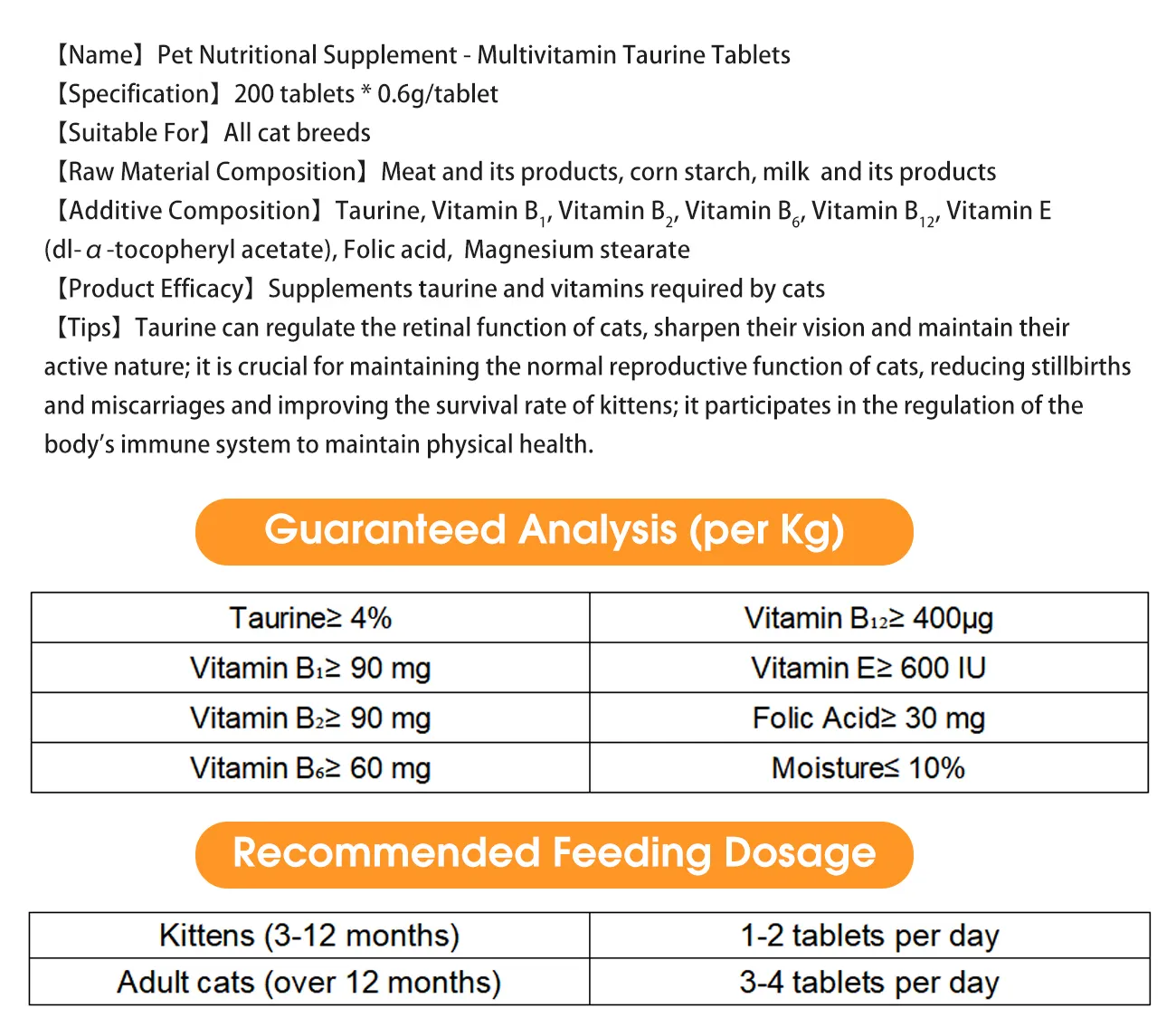 Taurine can regulate the retina function of cats, improve their vision, and maintain their activity; It is crucial for maintaining the normal reproductive function of cats, reducing stillbirths and miscarriages, and improving the survival rate of kittens; It participates in regulating the body’s immune system to maintain physical health.
